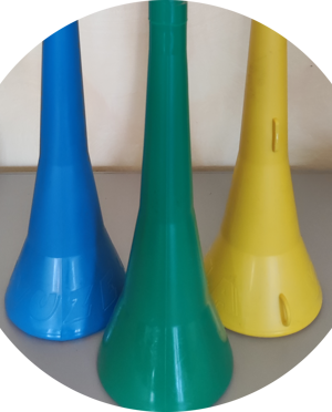 La vuvuzela è una tromba ad aria in polipropilene lunga 62 cm circa con impressa la scritta "VUVUZELA". Produce un suono potente e monocorde.