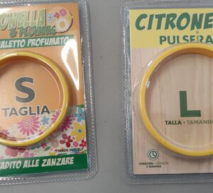 I braccialetti antizanzare vengono prodotti di due versioni.Una versione ad anello chiuso in due misure ( S e L) , e una versione aperta , con lunghezza 27 cm, e chiusura a fibia. Entrambi realizzati in materiale gomma termoplastica ed essenze alla citronella o altre.